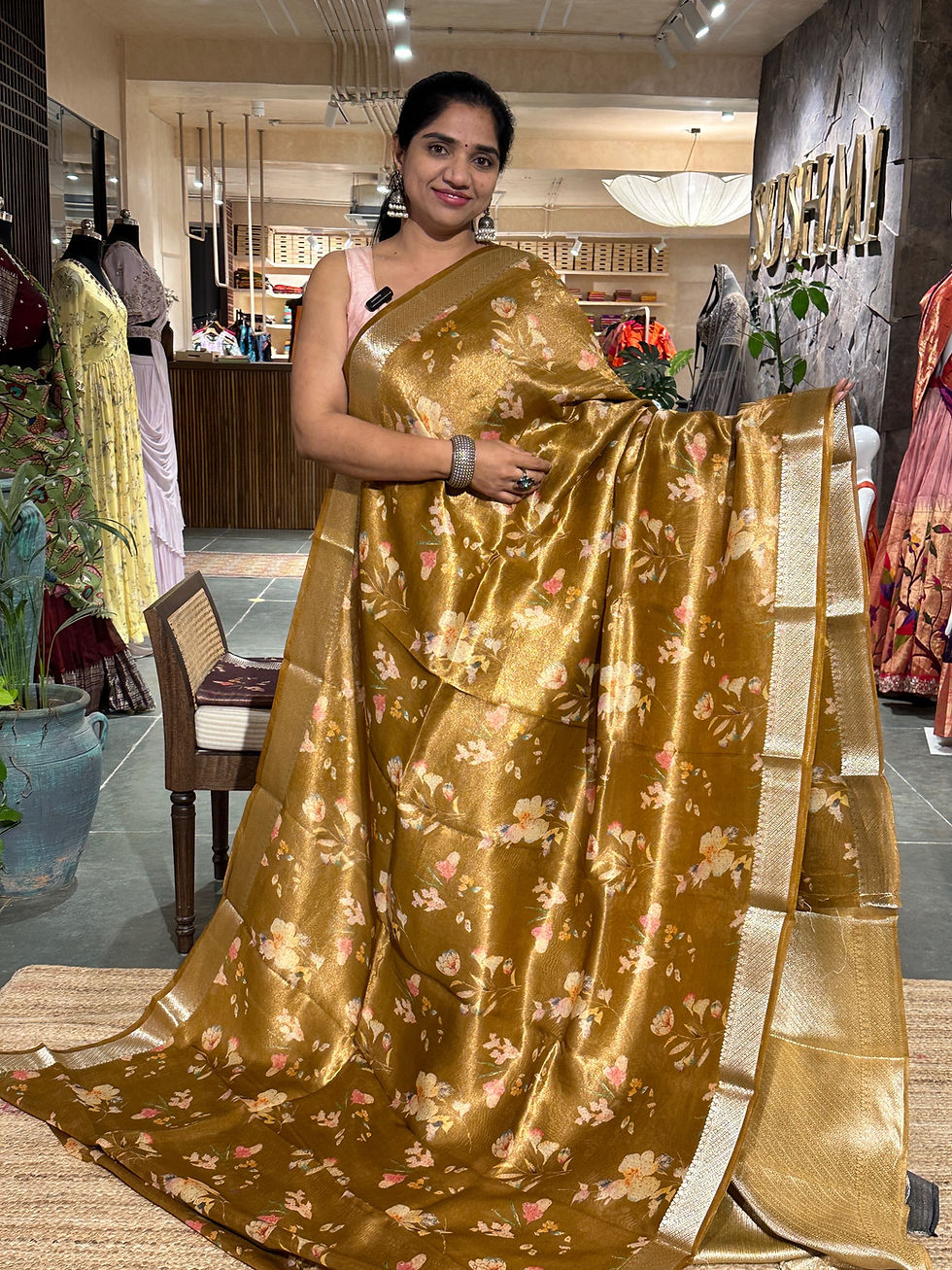 Mustard Banarasi Floral Printed Cotton Tissue with brocade pallu and blouse