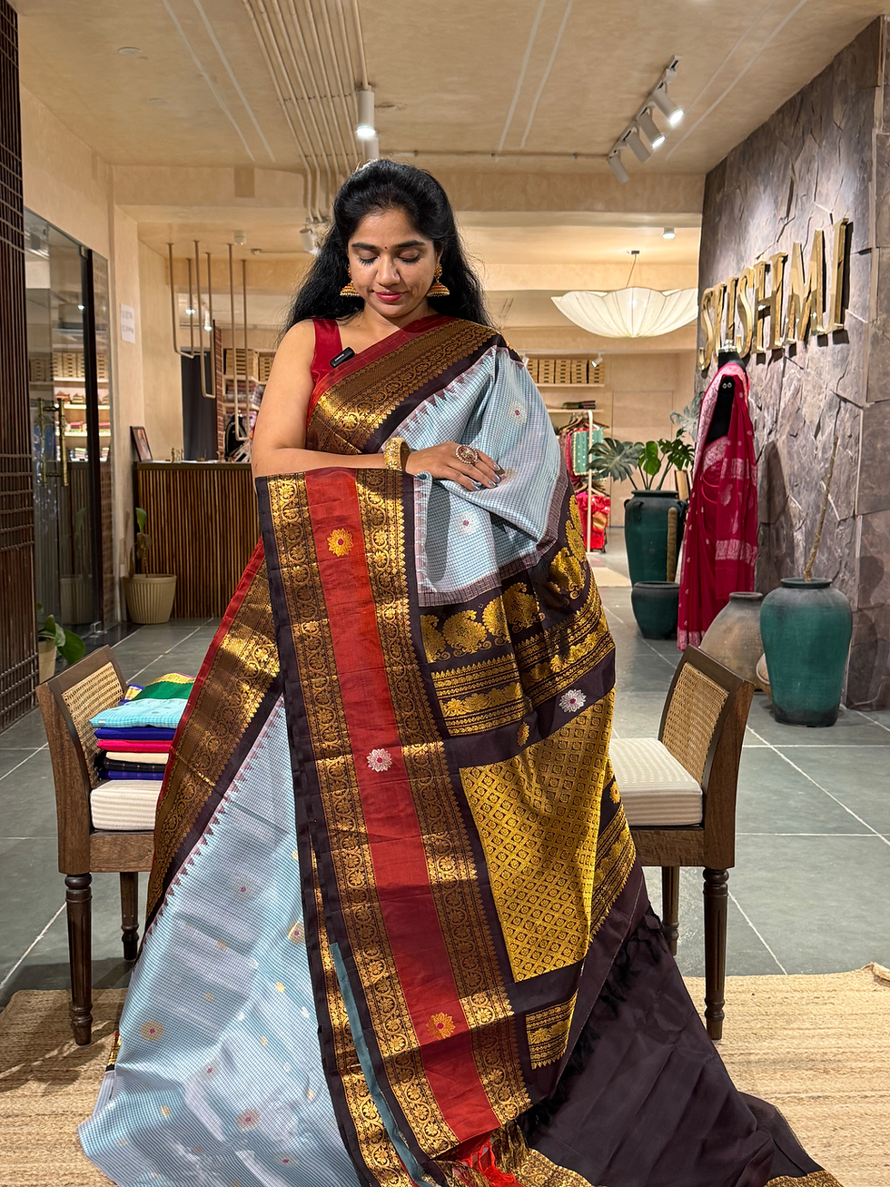 Powder Blue , Rust & Brown Combo Gadwal Silk Saree with Kuttu borders : GADKGM4
