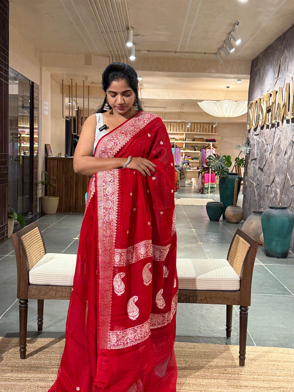 Chilli Red Banarasi Handloom Khaddi Chiffon Saree with silver
