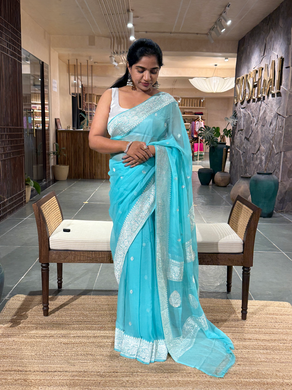 Sky Blue Banarasi Handloom Khaddi Chiffon Saree with silver
