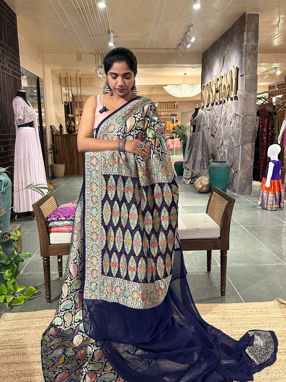 Midnight Blue Banarasi Khaddi Gorgette with Paisleys and Floral allover jaal