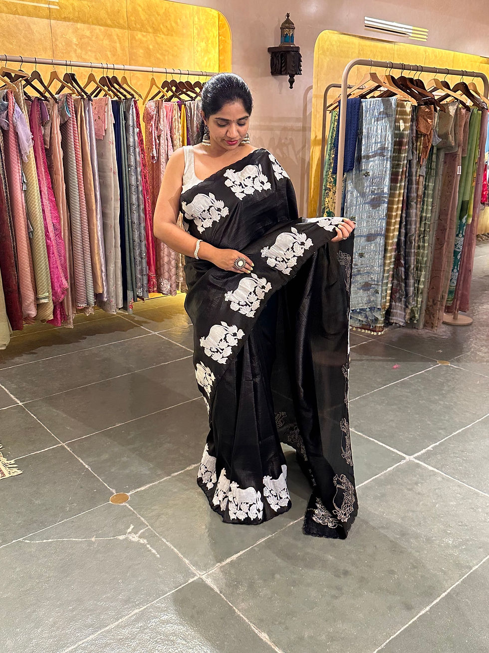 Black Satin Organza Saree with a slight Crush With Pichwai Applique work motifs