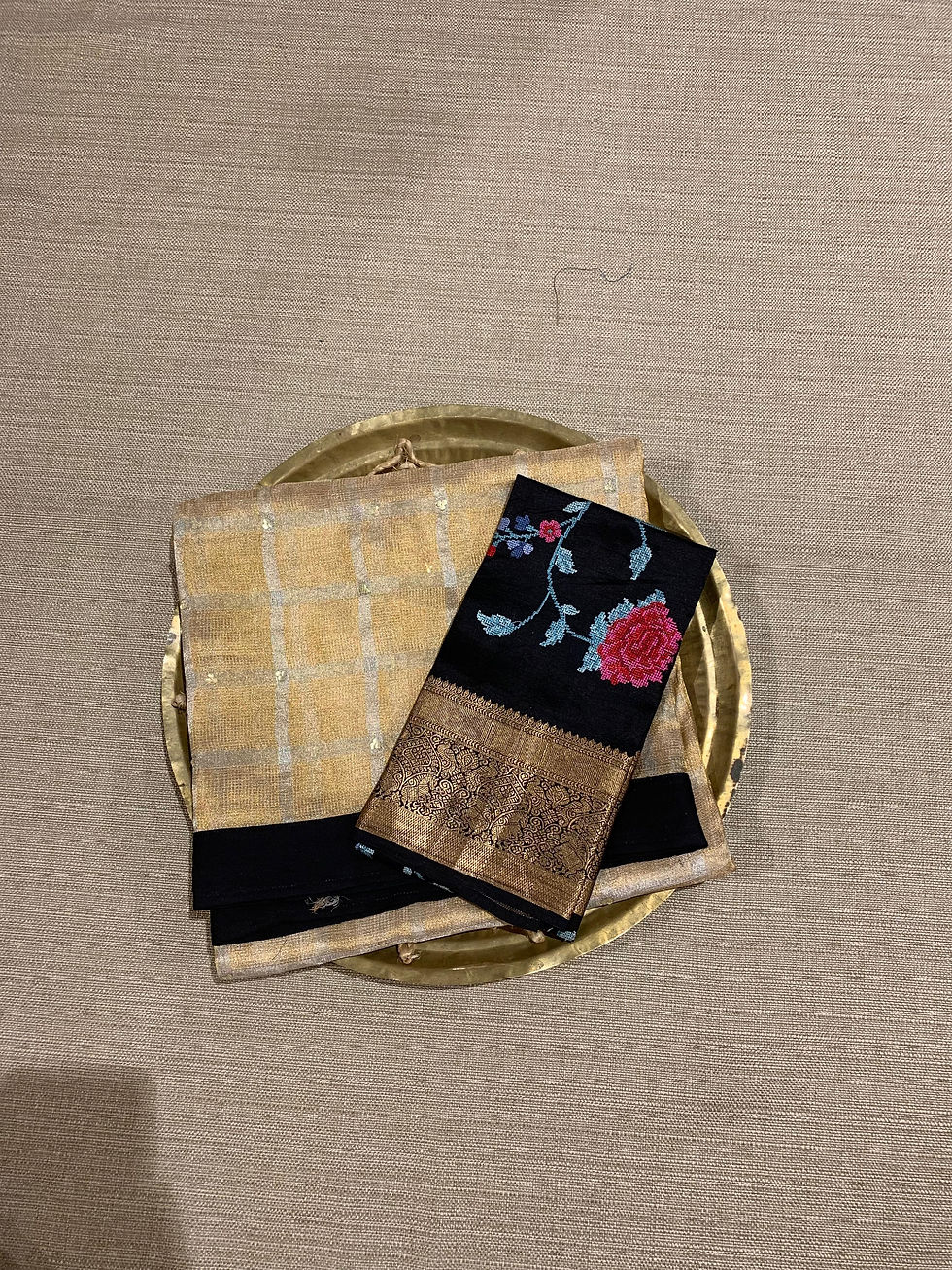 Designer Gold tissue saree with kanchi blouse with pythani style embroidery