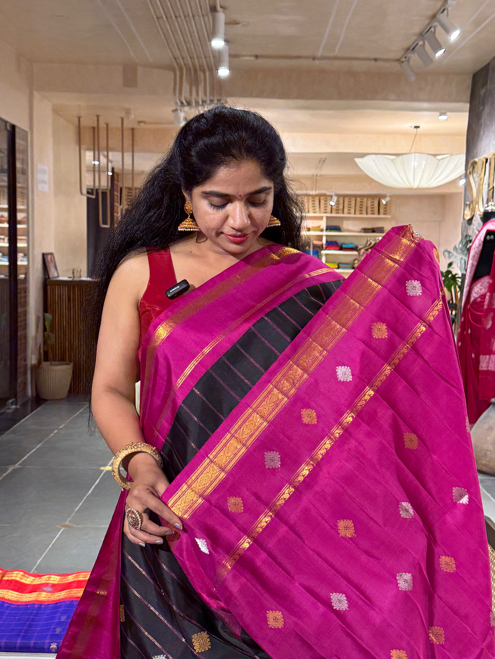 Black and RaniPink Gadwal Silk Saree with kanchi Kuttu Gap borders : GADKGM7