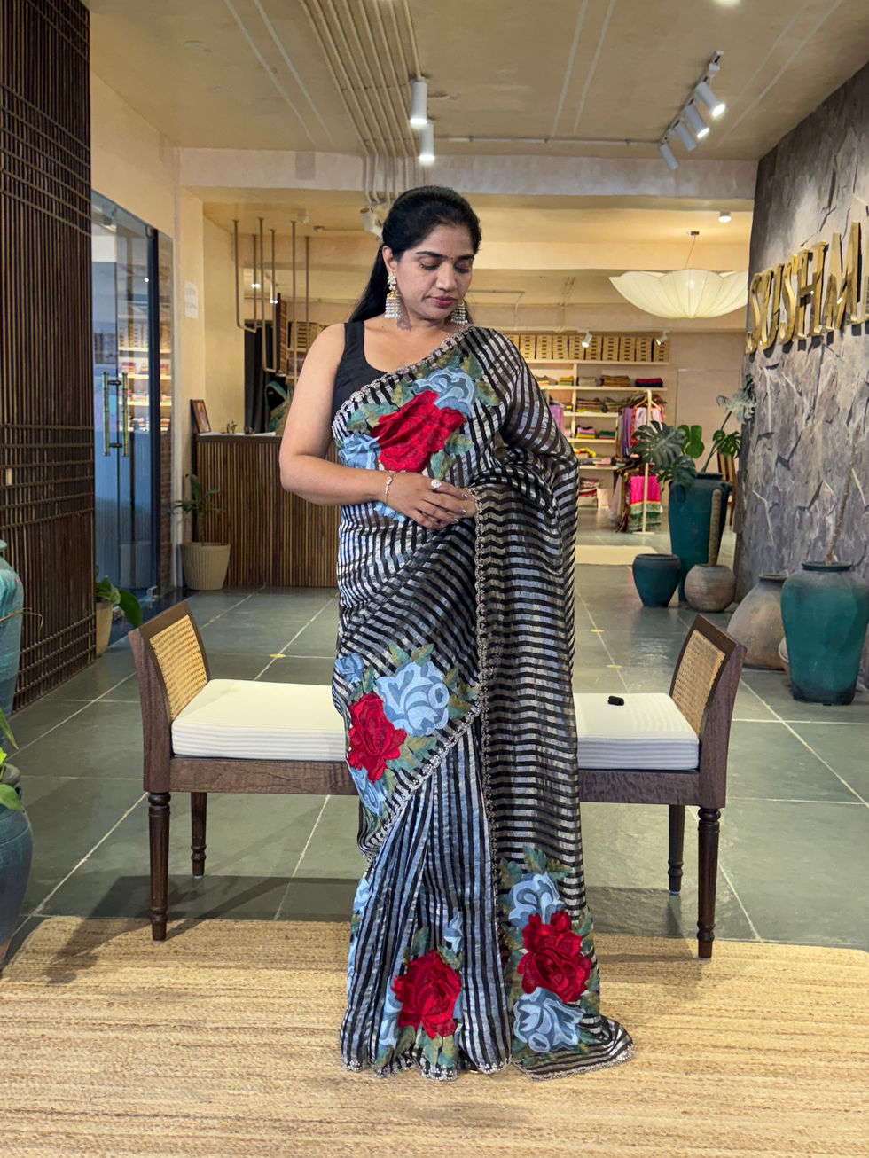 Black & Silver Stripes Tissue Silk Saree with Statement Floral bunch embroidery