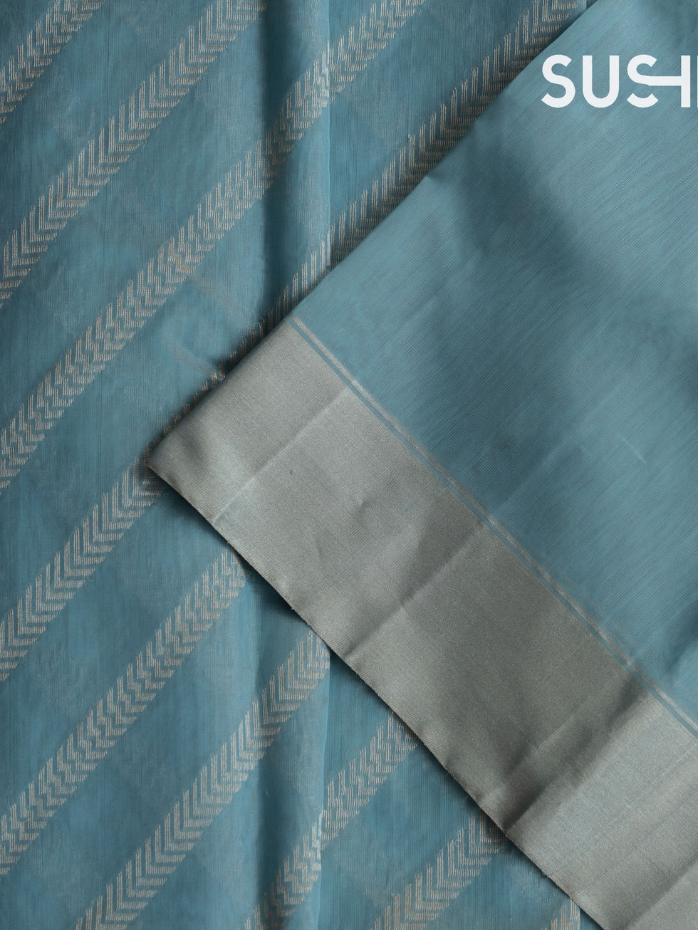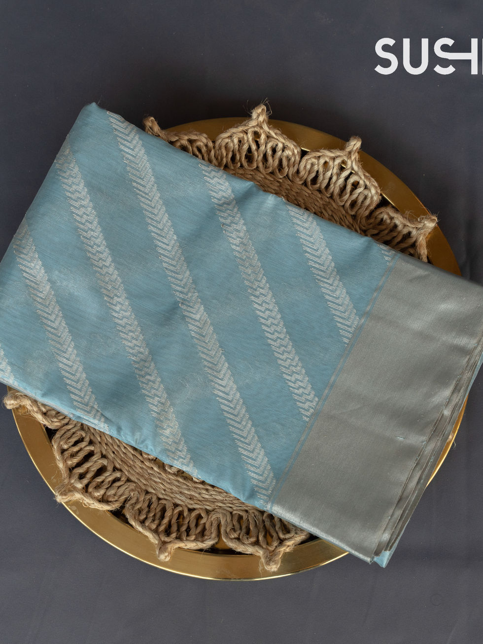 Pastel blue Chanderi silk saree in beautiful contemporary lehariya style pattern allover the saree in silver zari weaving.