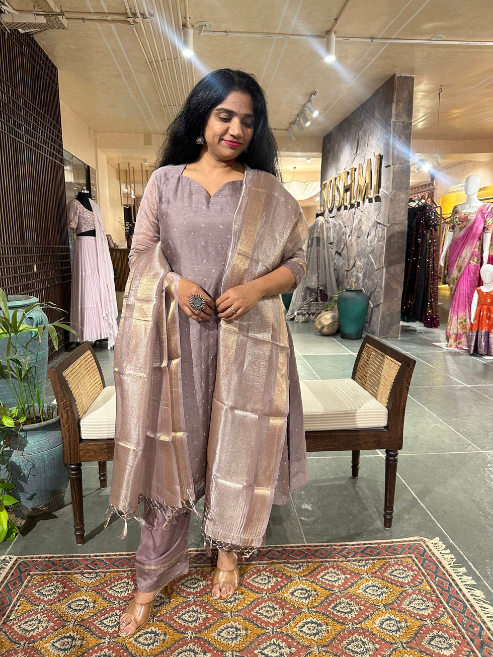 Earthy Tone pure Chanderi Silk 3 pc sticthed suit with mirror work