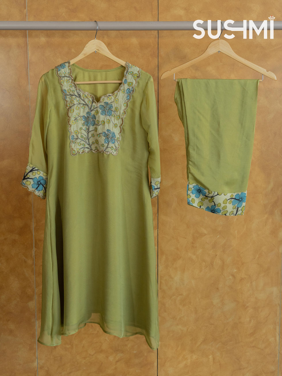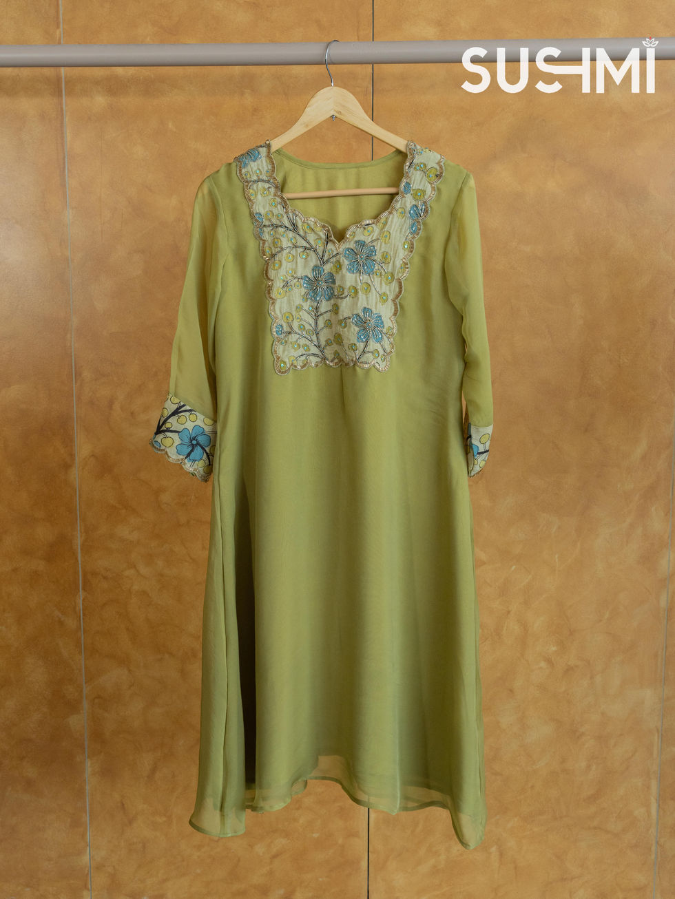 Sleeves are hemlined with pen kalamkari and scalloped handwork