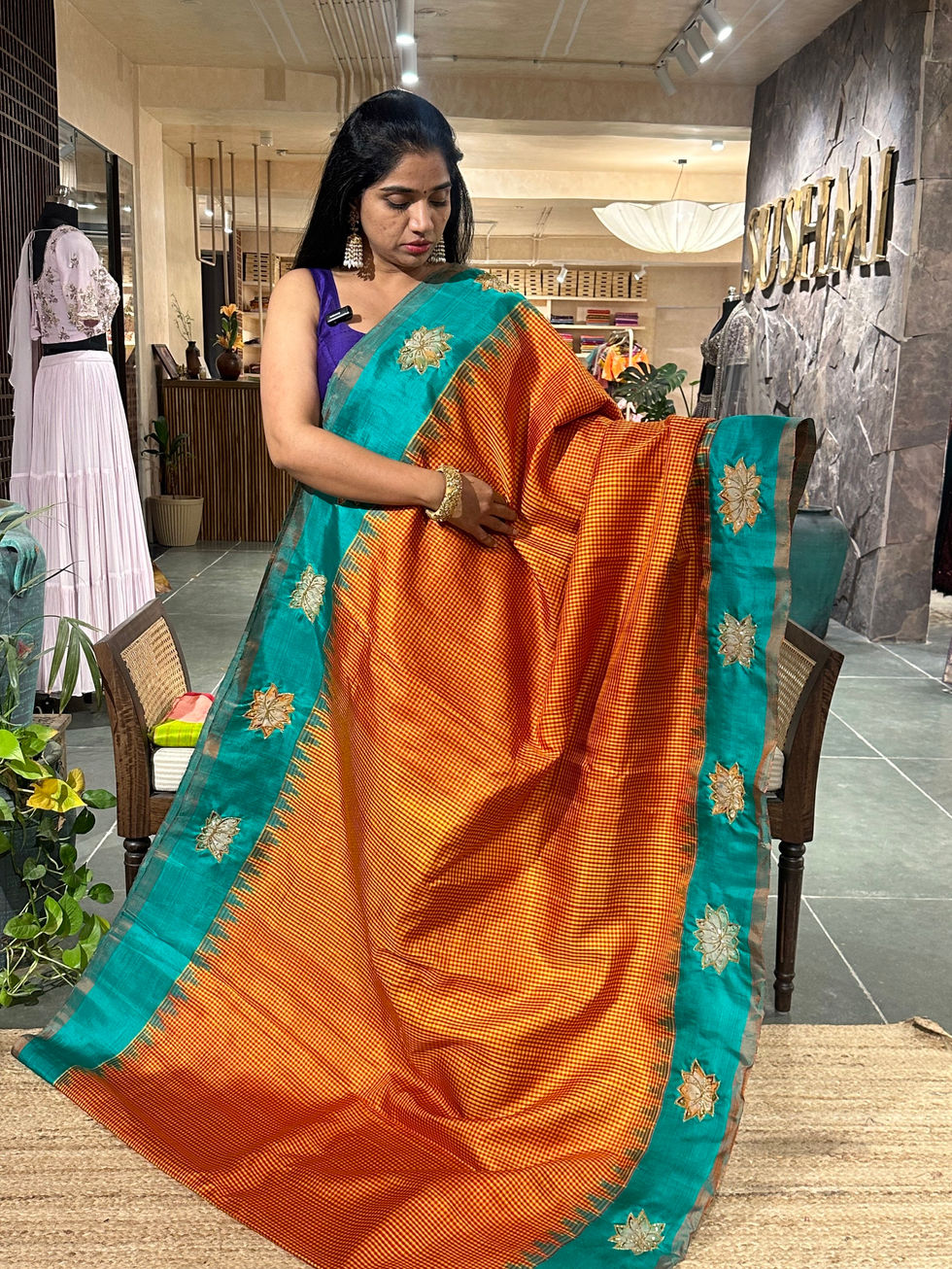 Gadwal Pure Silk Sarees with pan kalamkari applique work done on border pallu and blouse , with handwork highlighting .