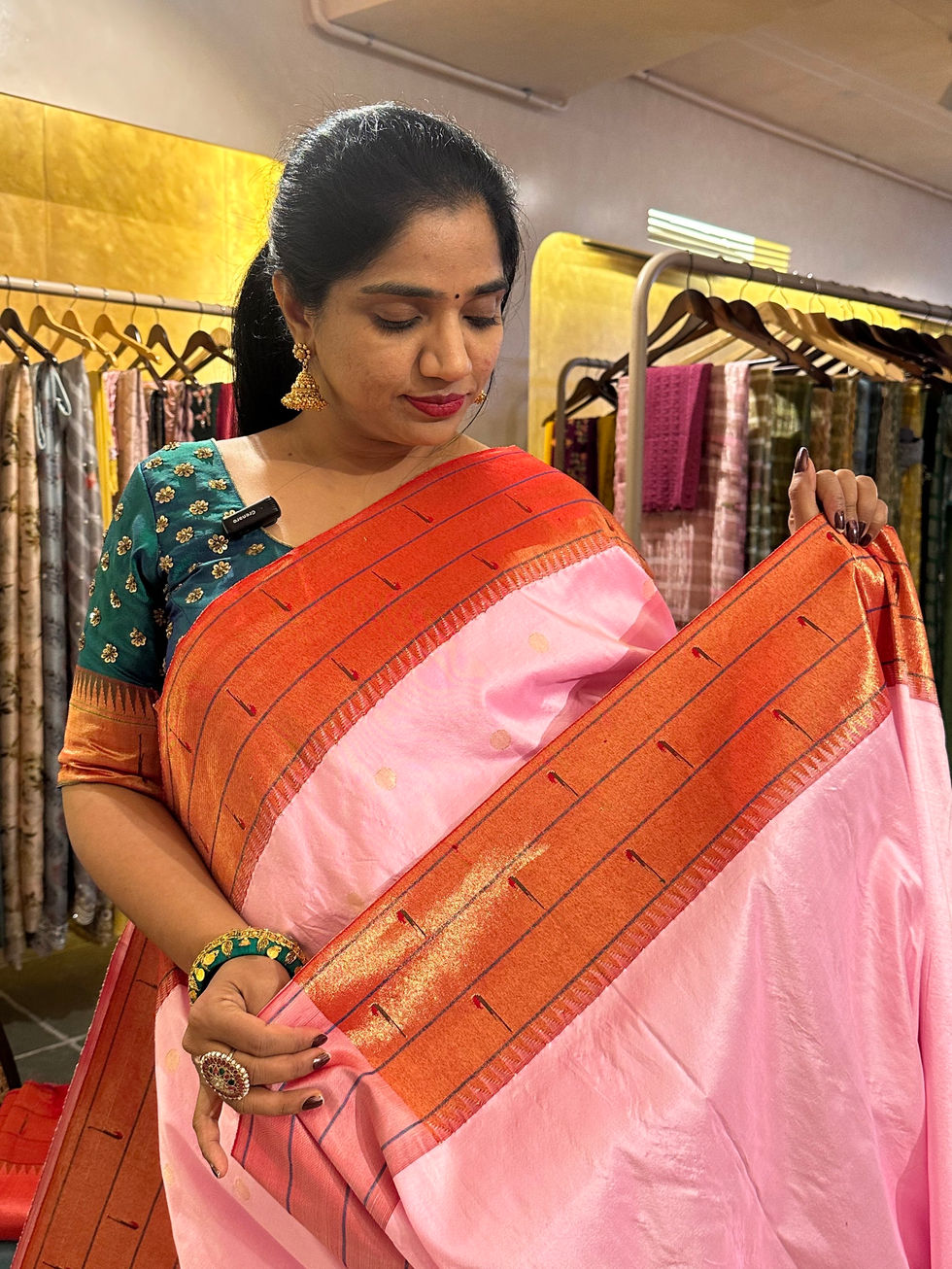 Light Rose Pink Tripple Muniya Pure Handloom Painthani Saree