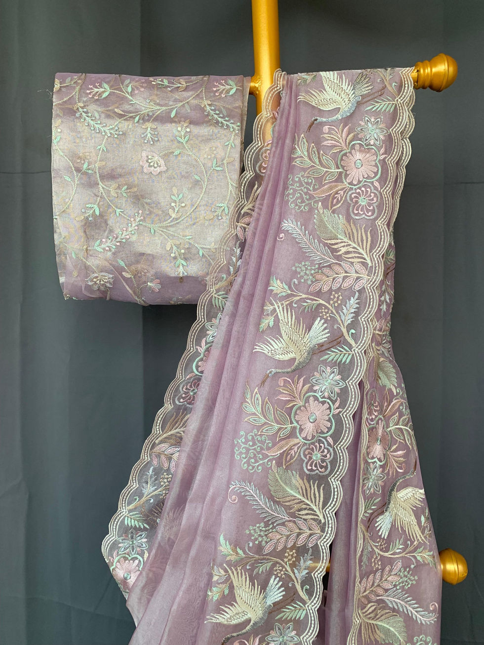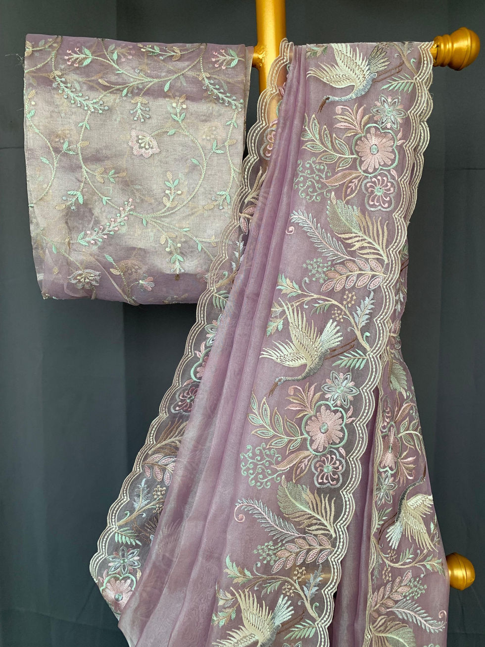 Lilac kora Tissue Designer Saree with heavy embroidered Borders .