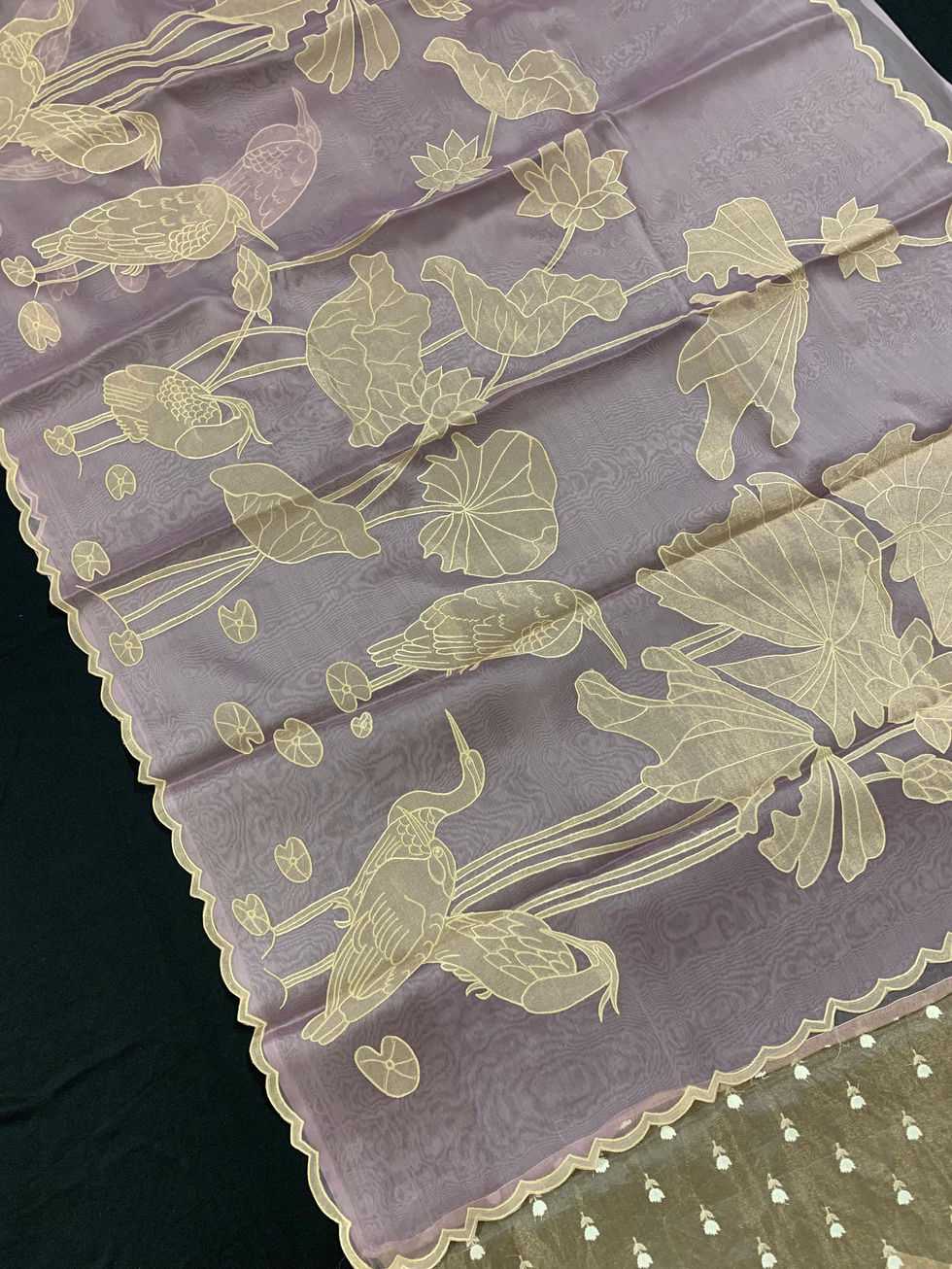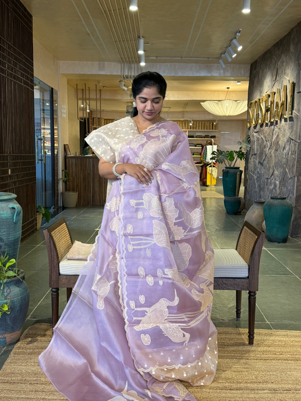 This Lilac Pure Organza Designer Saree is a Masterpiece which features an all-over Light Gold Tissue Applique Embroidery with a stunning lotus pond design, complete with swans, lotus flowers, and leaves, and is hemlined with beautiful scalloped cutwork done with tissue fabric.