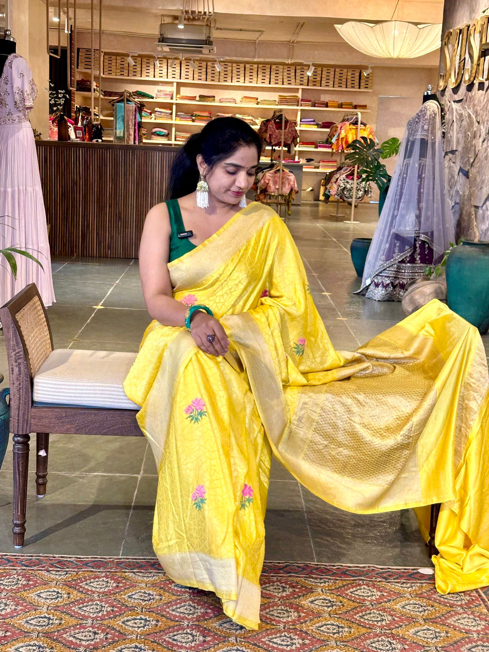 This stunning Mango Yellow Pure handloom Mashru Satin Silk Designer Saree boasts a subtle 2 inch dull gold zari border and zari pallu, adorned with intricate handwork featuring resham flower bunches throughout. A standout feature of the saree is its bold geometrical threadwork texture, which adds a modern touch to the overall design. The accompanying blouse is crafted from plain mashru silk with a dull gold zari border.