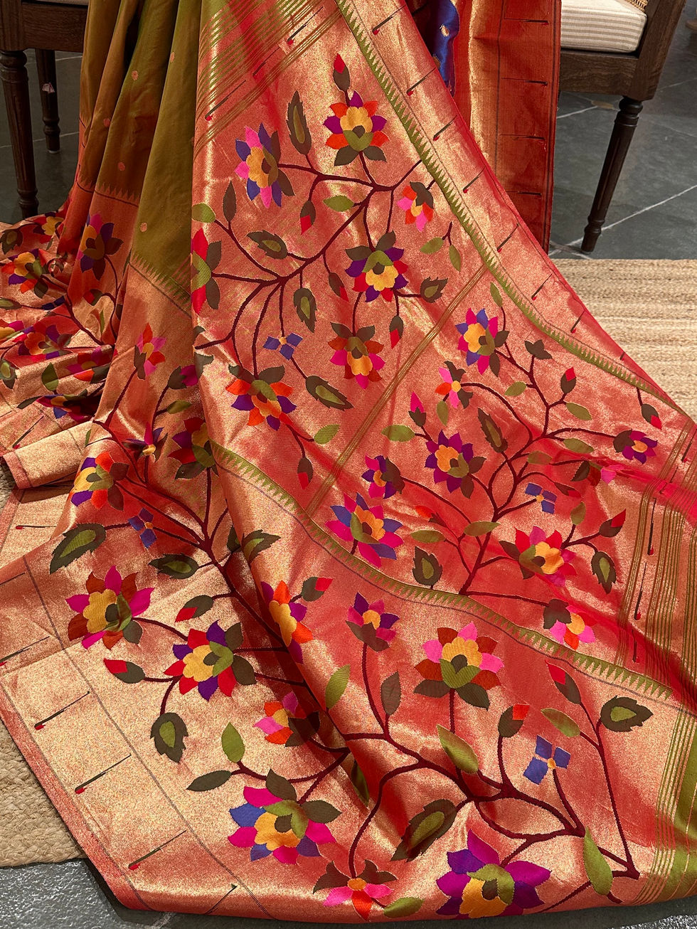 Mehendi Green Half Allover Pure Handloom yeola Paithani Saree