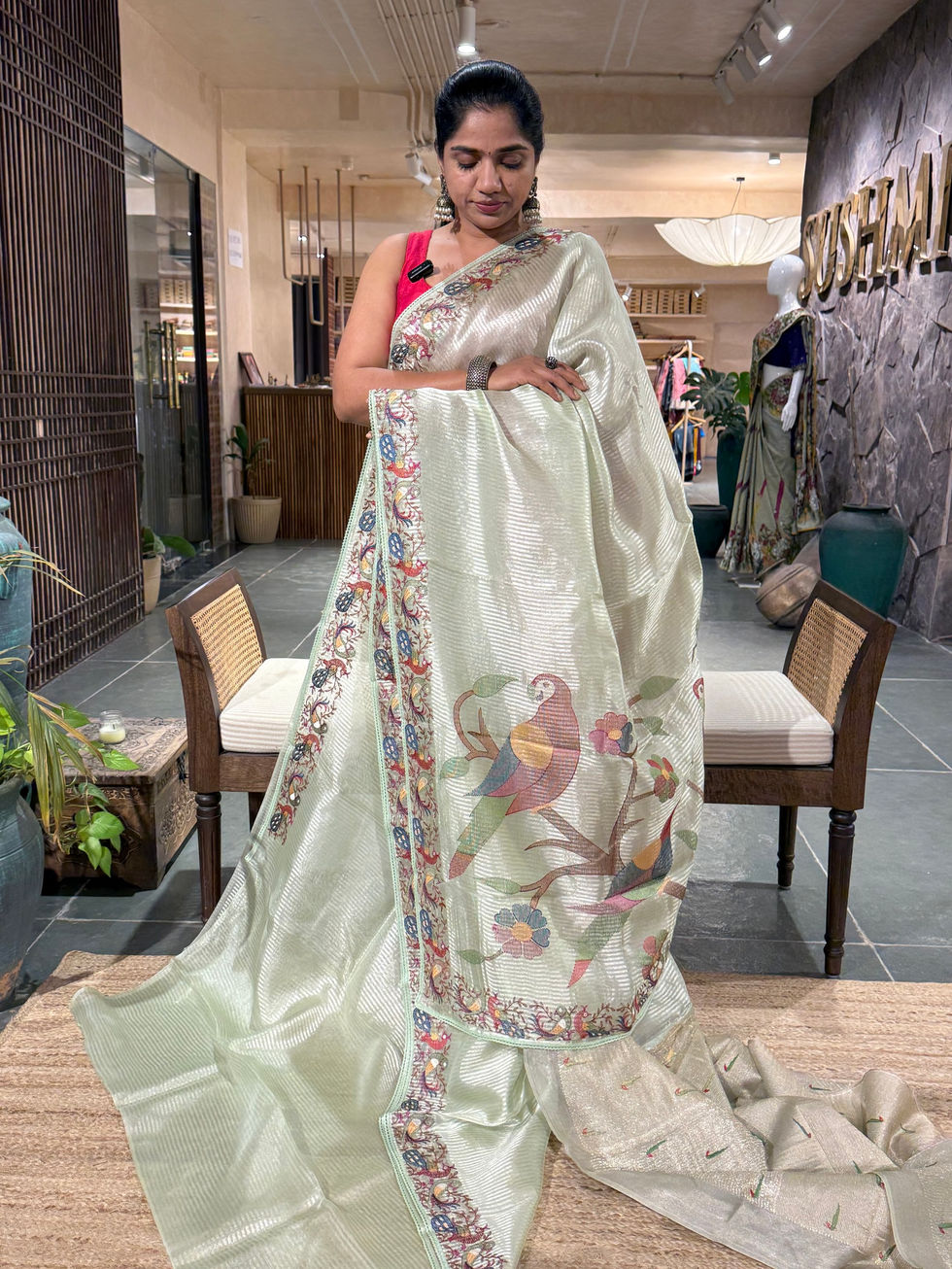 Mint Green Banarasi Kora Tissue Saree with paithani inspired embroidery