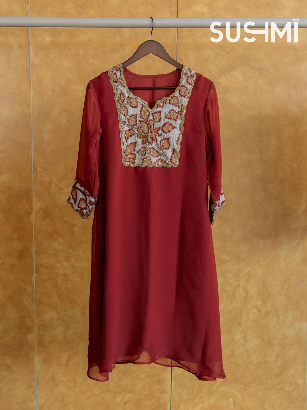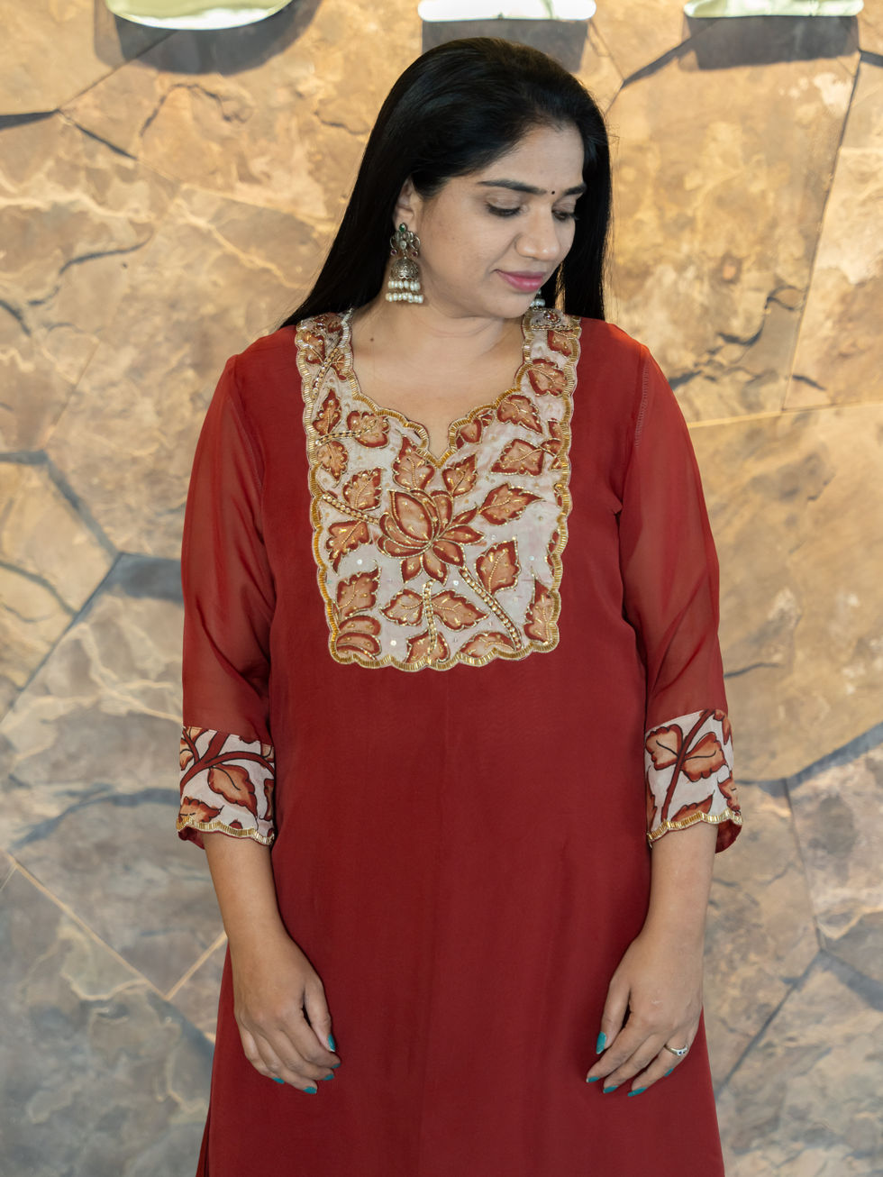 A- Line cut Organza and pen kalamkari silk fusion coord set .