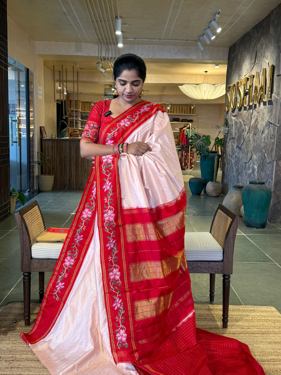 This pure silk saree features an all-over zari check pattern, complemented by a contrasting red gap border adorned with petite point embroidery. The matching blouse boasts a red checkered body and a petite point embroidered border.