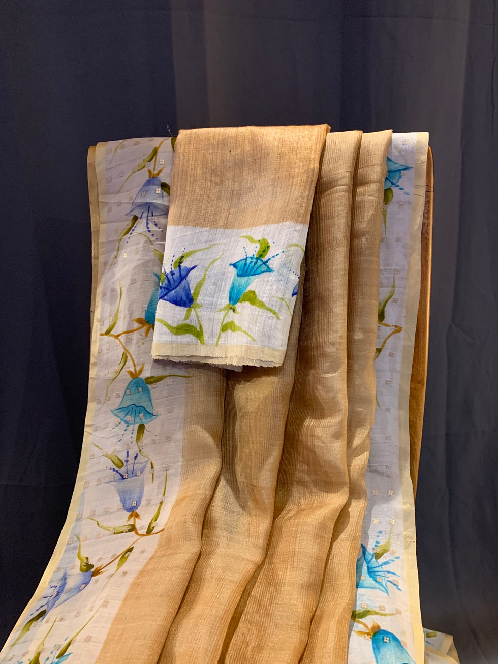 Saree body is a blend of silk cotton and Tissue . Border is of matka silk with handpainting .