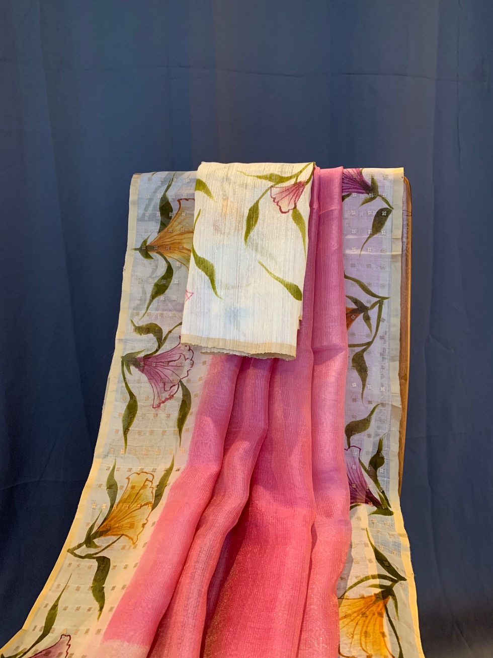 Handloom Bailou Saree with beautiful handpainted border , pallu and blouse . Border has got embedded sequnce allover the border.