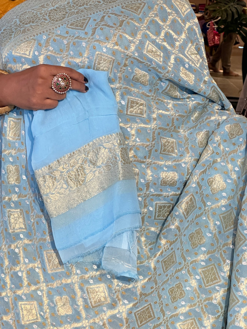 Powder Blue Premium Kora Banarasi Silk Saree with kaduwa weaving : KBSM13