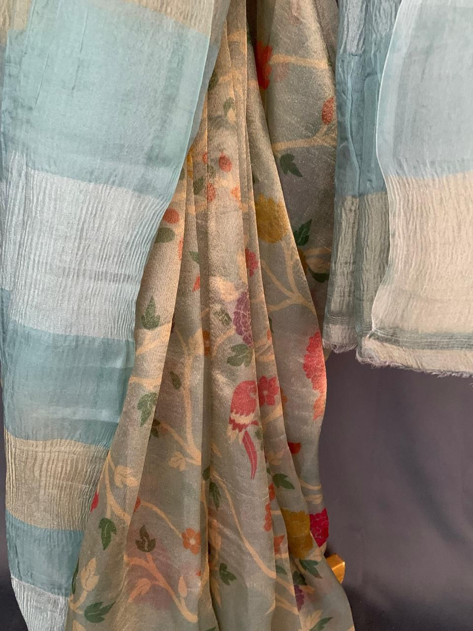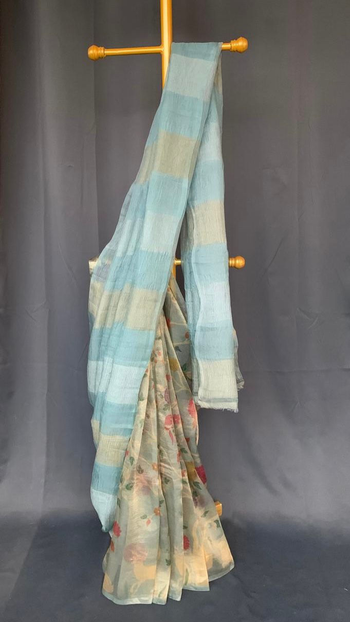 Powder Blue Printed Tissue Half and Half Style Saree