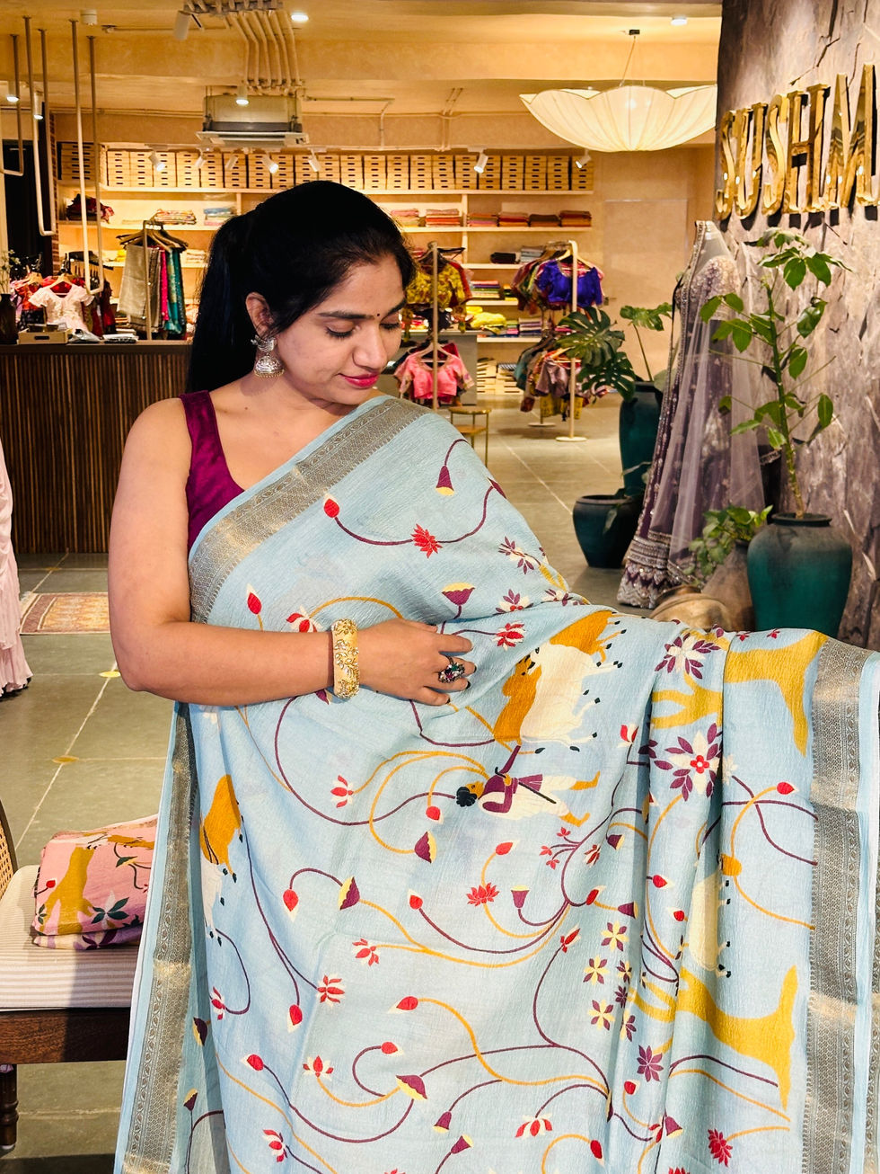 Powder Blue Pure Banarasi Munga Silk Saree with antique zari banarasi border and stunning pichwai digital print and also pythani inspired allover the saree. Blouse is pure munga silk wuth dollar weaving butis .