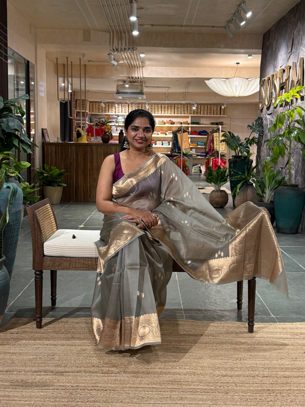 This premium Kora Banarasi Silk Saree features an English Grey hue with an Olive Tinge, showcasing a stunning monotone look with striking borders and Pallu. The saree's body is adorned with a combination of silver and golden zari, featuring a trio of motifs. The accompanying blouse is crafted from self-color kora silk, complete with matching borders.