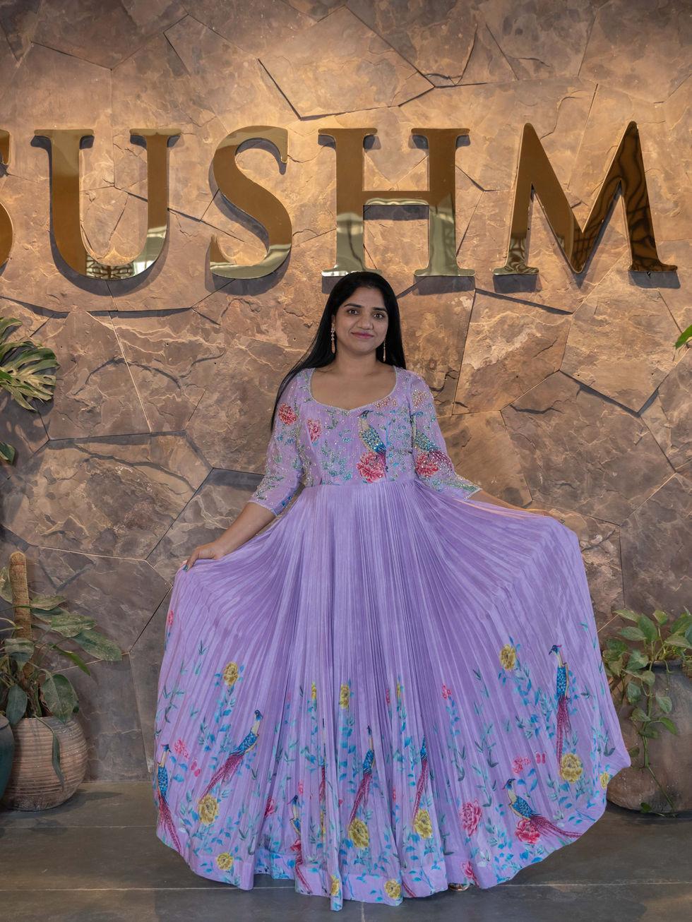 Lavender color Pure Chinnon printed long frock with beautiful floral and parrot design in skirt border style with heavy handwork highlighted yoke . It has got heavy ghera around 8-10 meters .