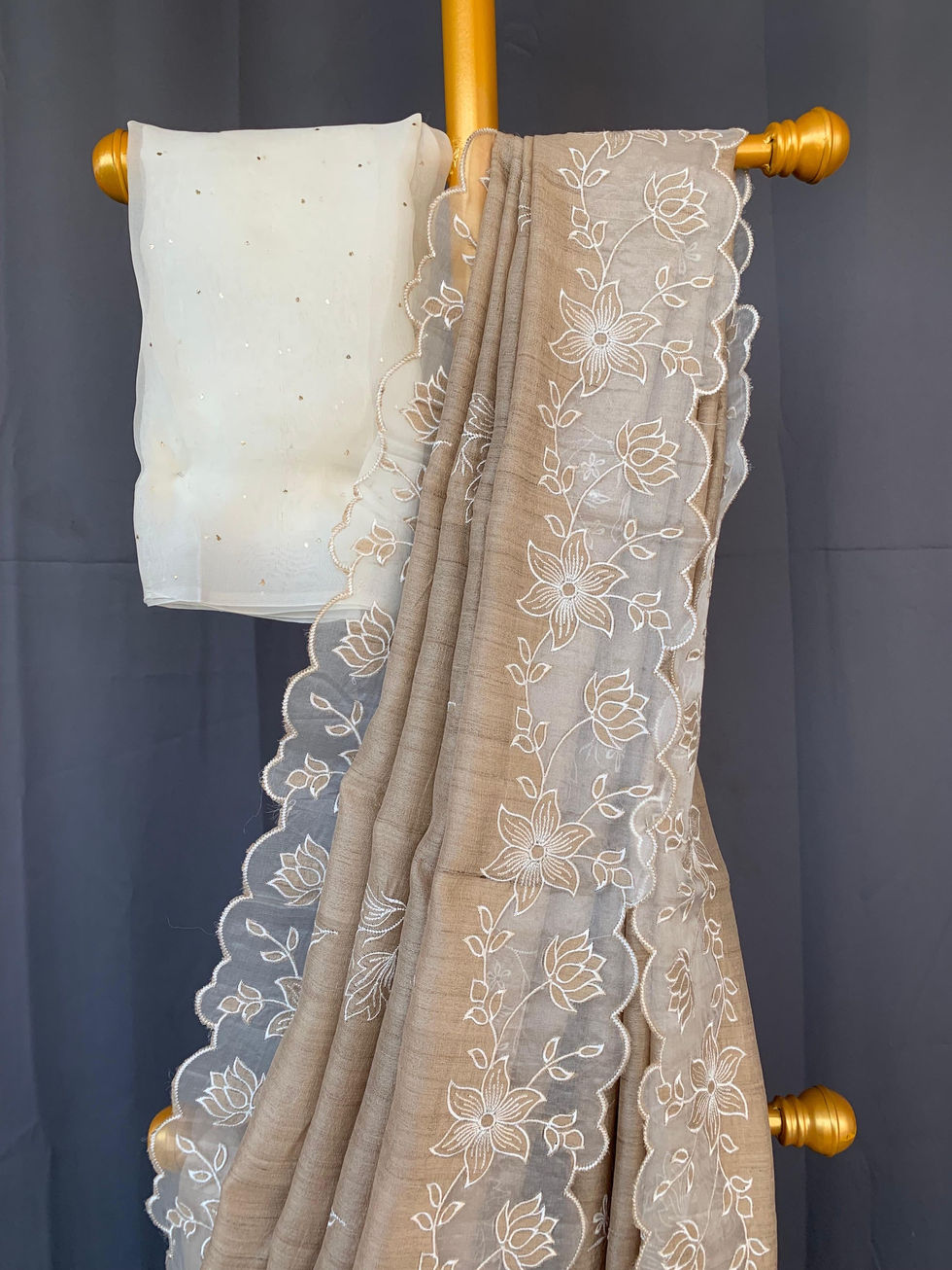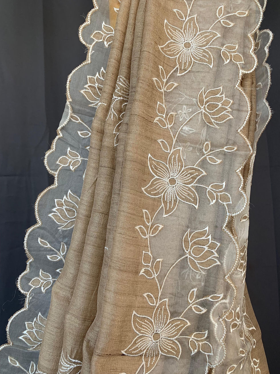Pure handloom Tussar Designer Saree with Organza Applique Cutwork Border and allover embroidered flower bunches .