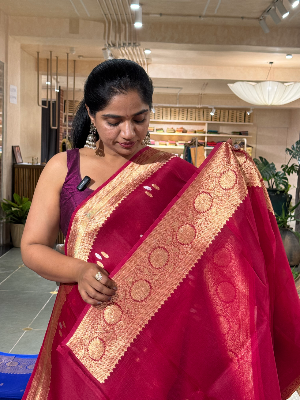 This premium and luxurious Kora Banarasi Silk Saree boasts a stunning Reddish Pink hue, showcasing a beautiful monotone look accentuated by striking borders and Pallu. The saree's body features an intricate combination of silver and golden zari, highlighted by a trio of motifs. The accompanying blouse, crafted from self-color kora silk, perfectly complements the saree with matching borders.
