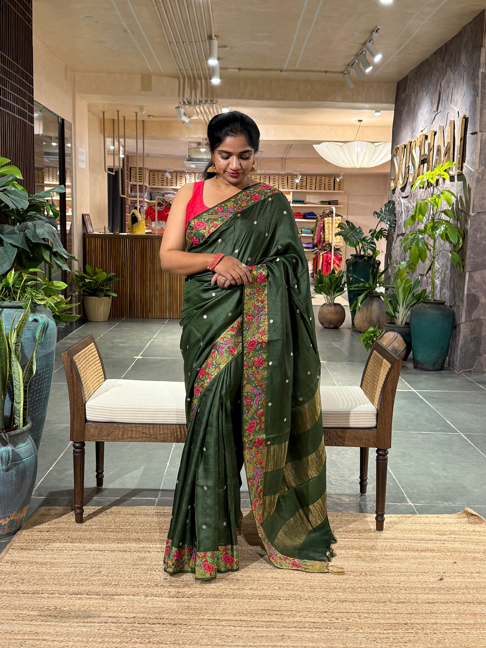 This luxurious Kora Banarasi Silk Saree boasts a stunning seaBlue hue, showcasing a beautiful monotone look accentuated by striking borders and Pallu. The saree's body features an intricate combination of silver and golden zari, highlighted by a trio of motifs. The accompanying blouse, crafted from self-color kora silk, perfectly complements the saree with matching borders.