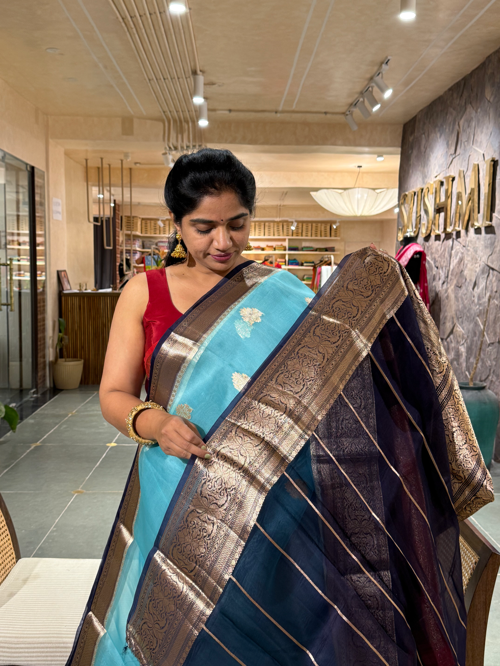 WDKS : SeaBlue and Midnight Blue Combo Banarasi Handloom Kora Silk Saree