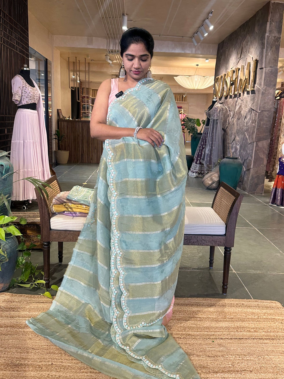 Sea Green color Tissue and kora brasso Saree in vertical stripes pattern with handwork borders and heavy allover handwork blouse in self color.