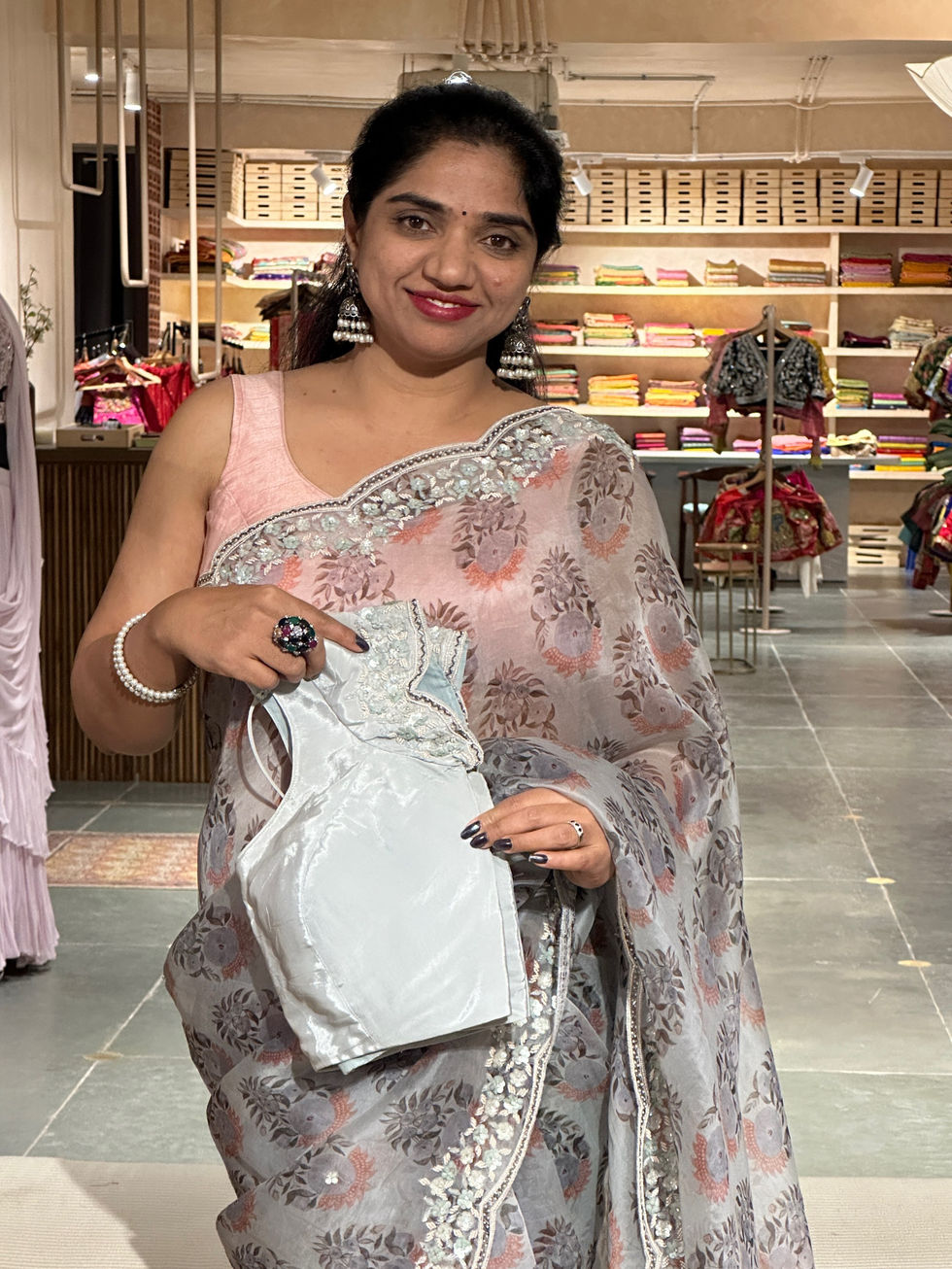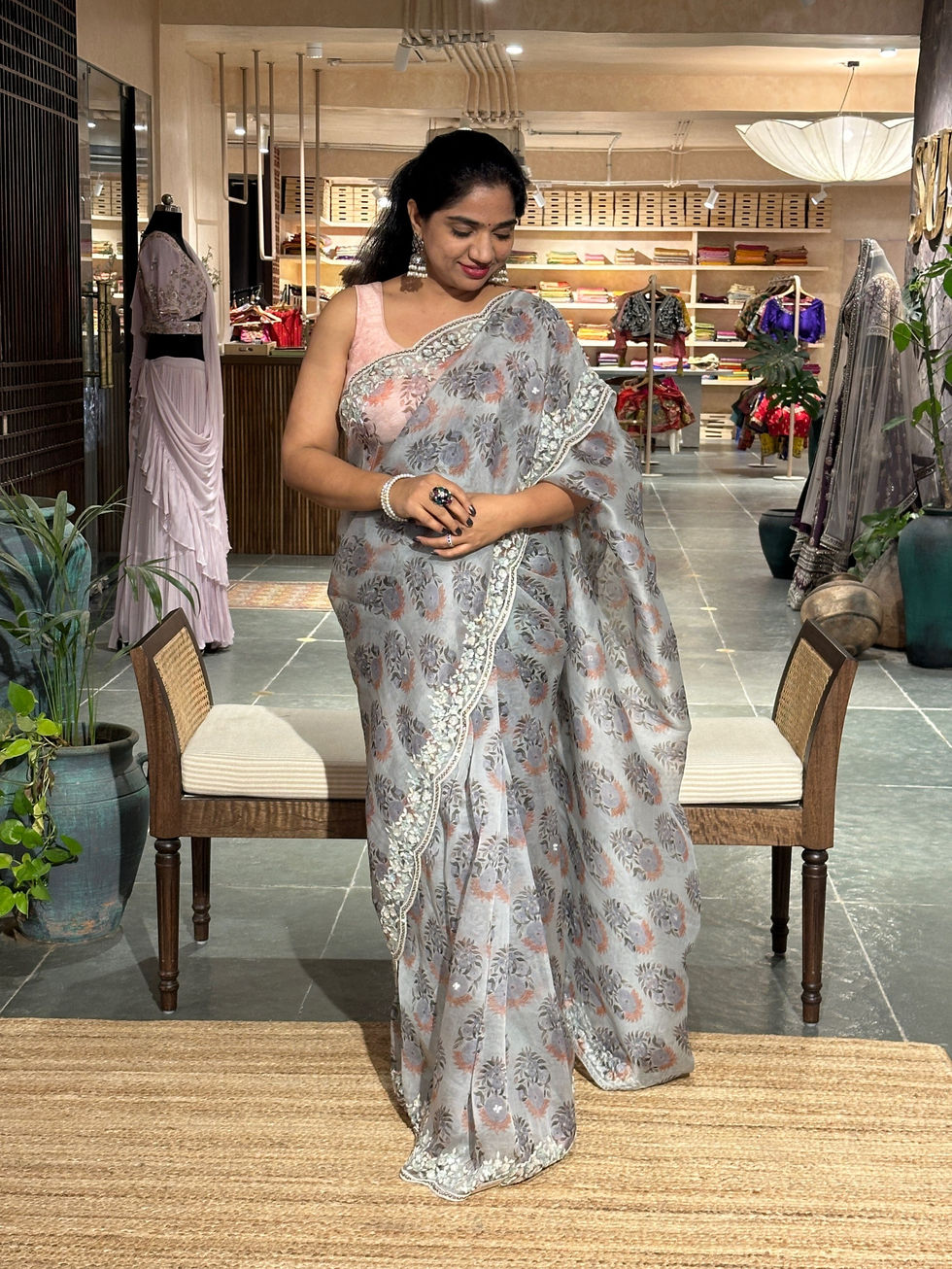 Pure Organza Saree with sabyasachi print and heavy handwork border.