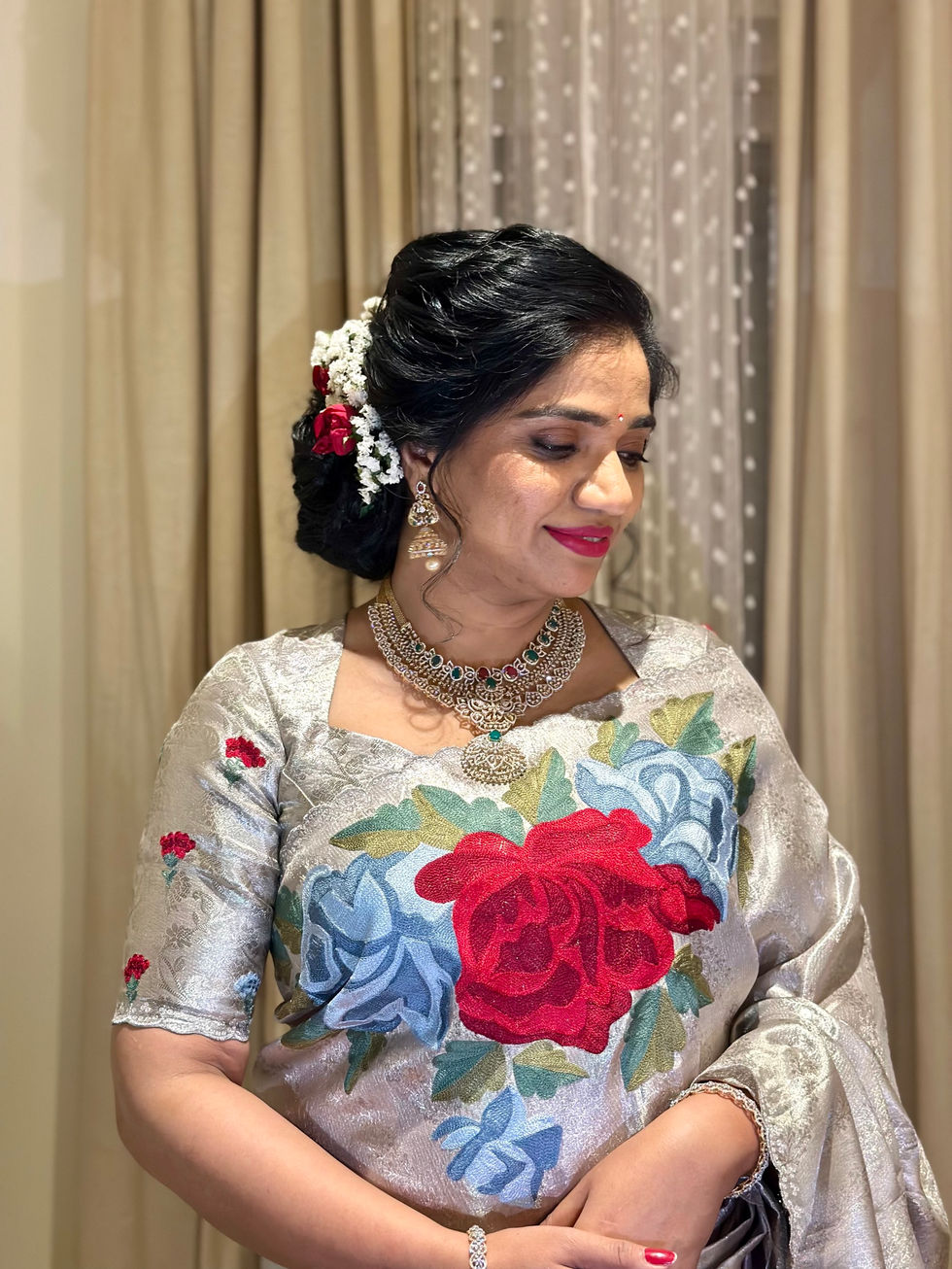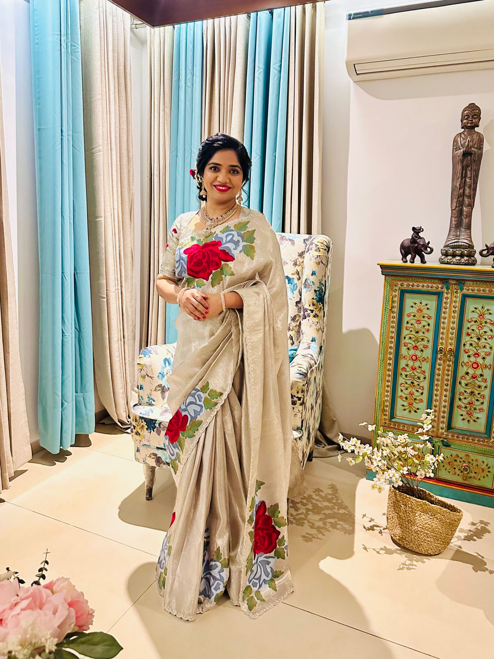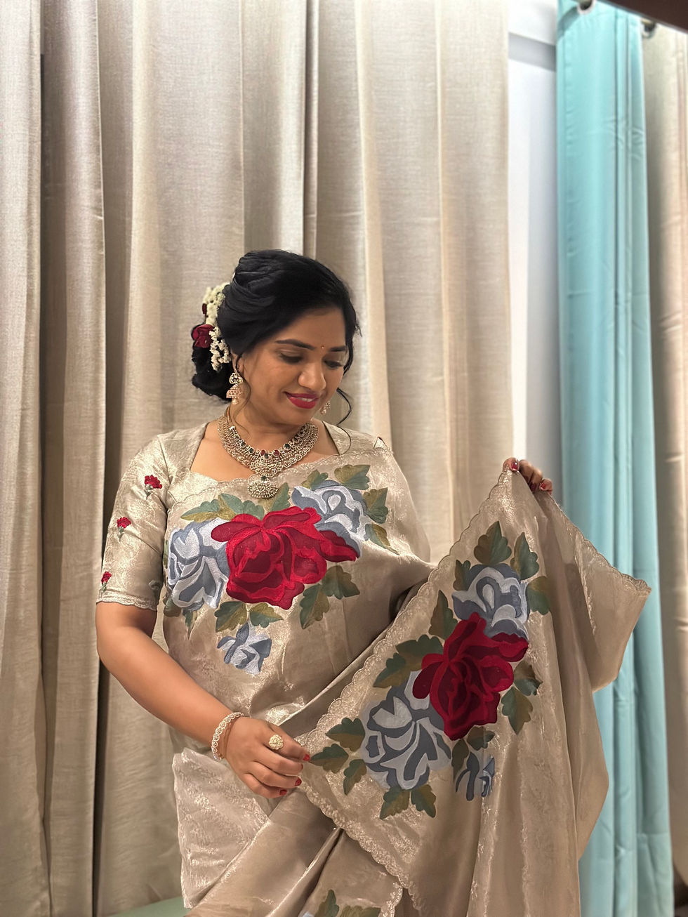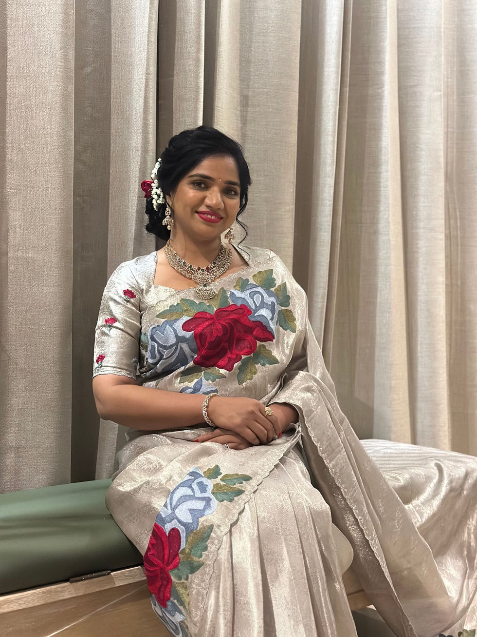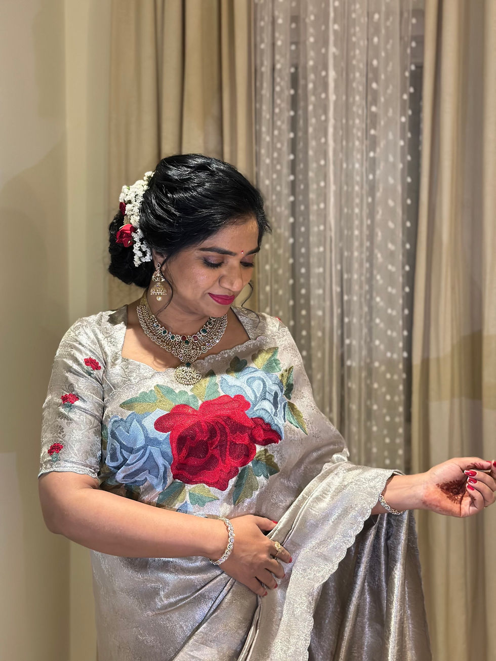 Silver Banarasi Brocade Tissue Saree with Big statement Floral embroidery