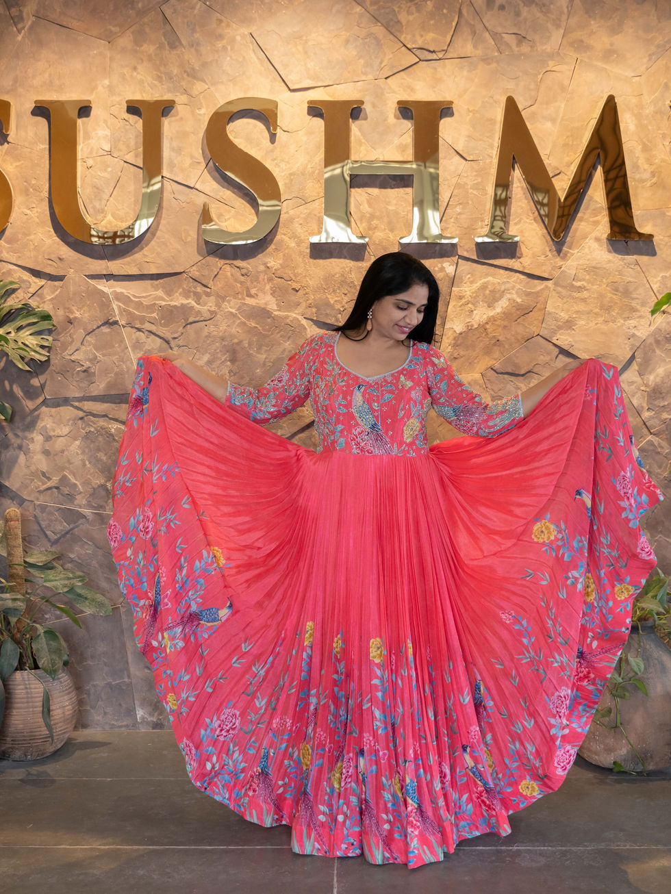 Tomato Red Color Pure Chinnon printed long frock with beautiful floral and parrot design in skirt border style with heavy handwork highlighted yoke . It has got heavy ghera around 8-10 meters .