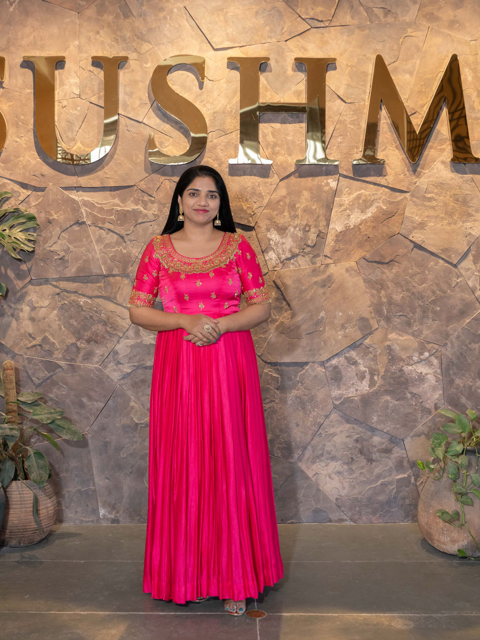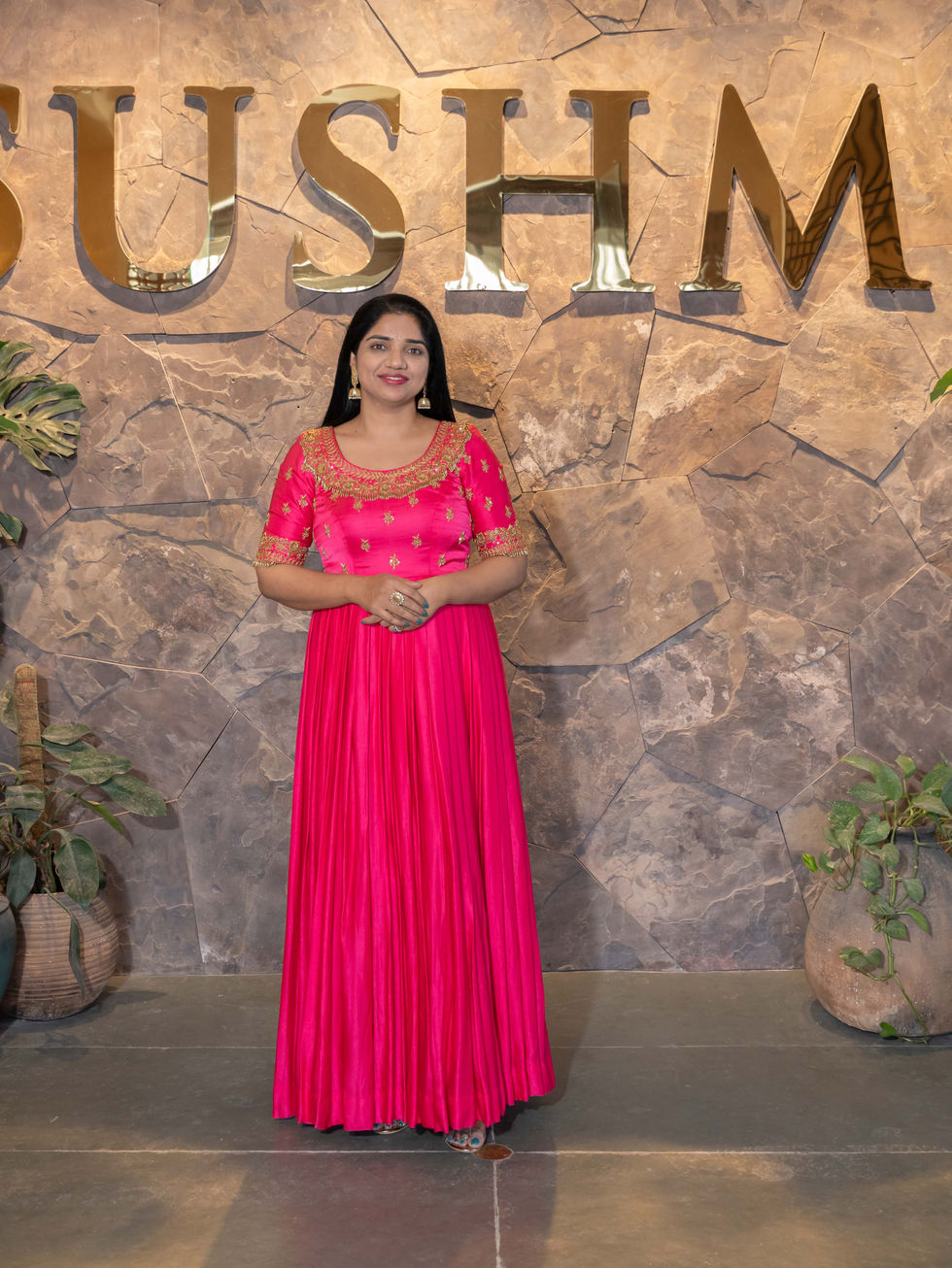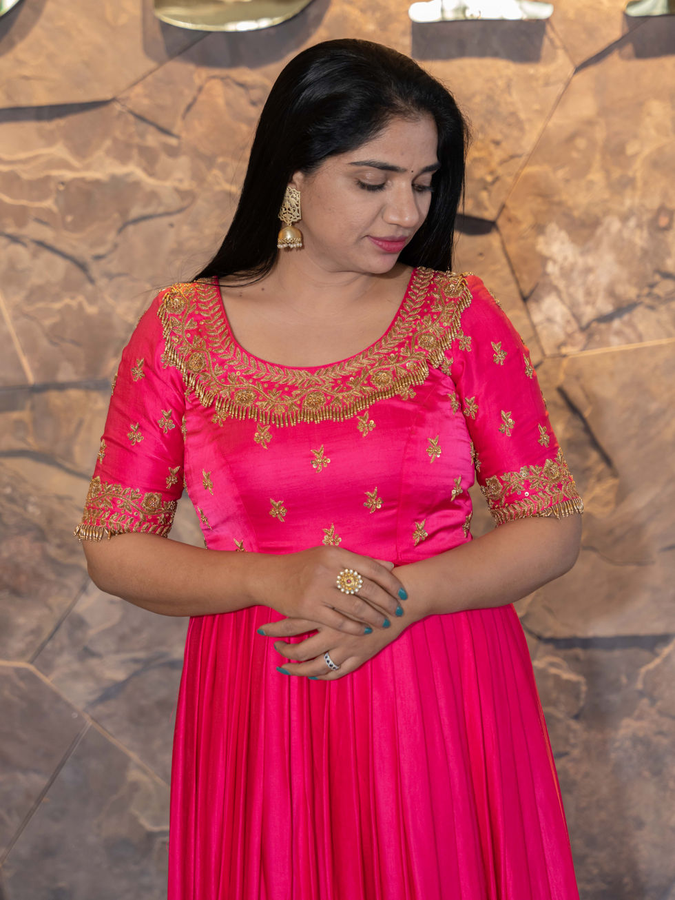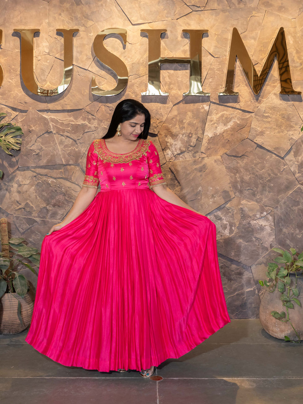 Beautiful pink long frock with heavy handwork yoke done with pleated style flair . This long frock can be paired any handloom dupattas like kalamkari kanchi , pythani , patola , ikkat etc to give a stunning sophisticated look .