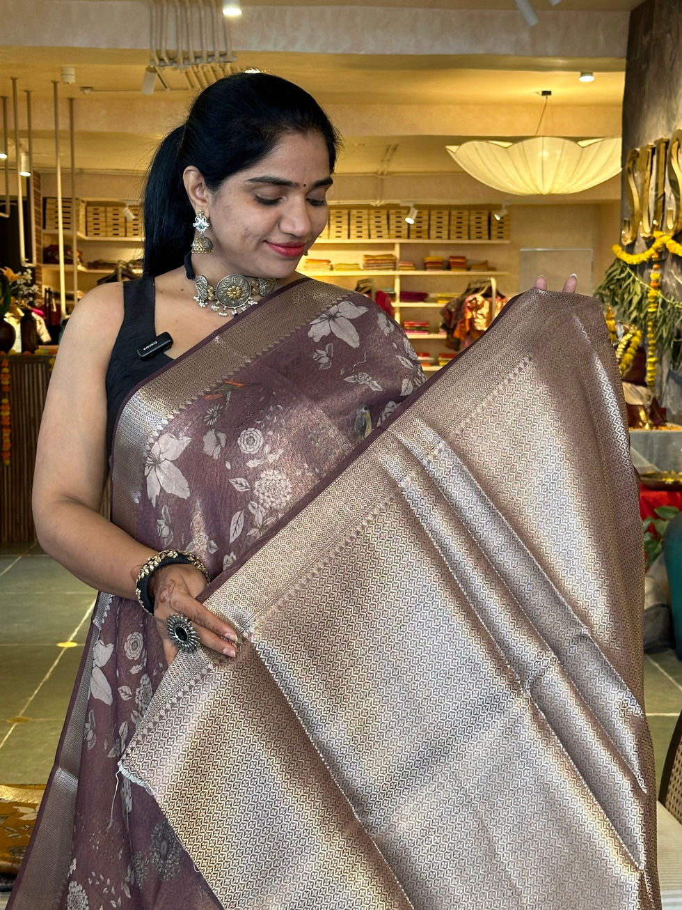 Wine Banarasi cotton Tissue saree with beautiful birds and floral prints . Pallu and blouse are of banarasi brocade .