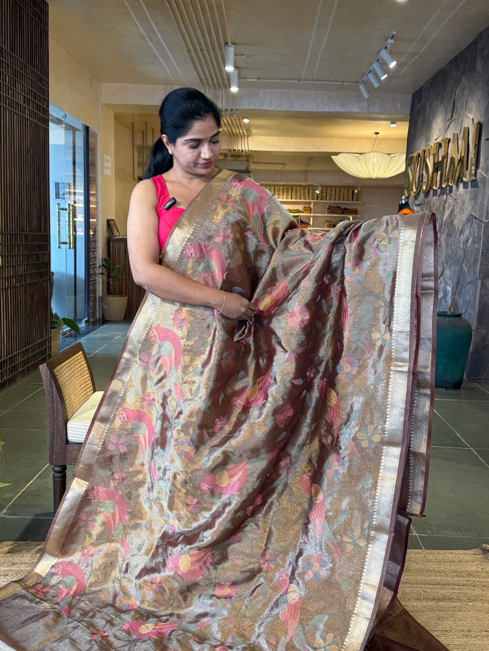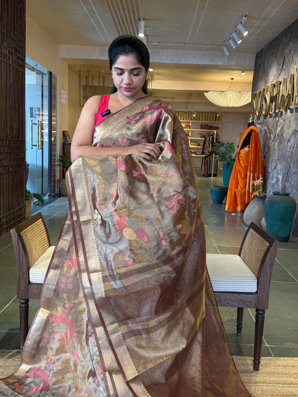 Pista Banarasi Crush Tissue Saree with allover Pythani inspired parrot and creeper style embroidery